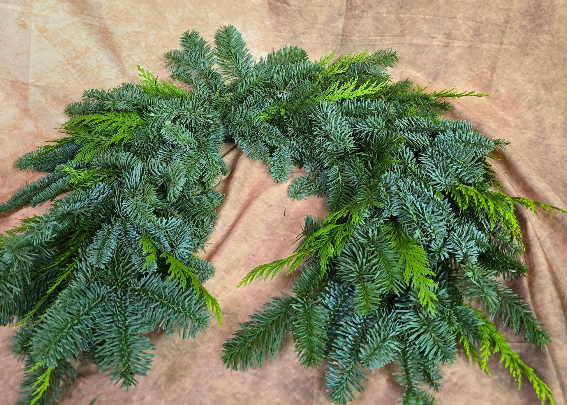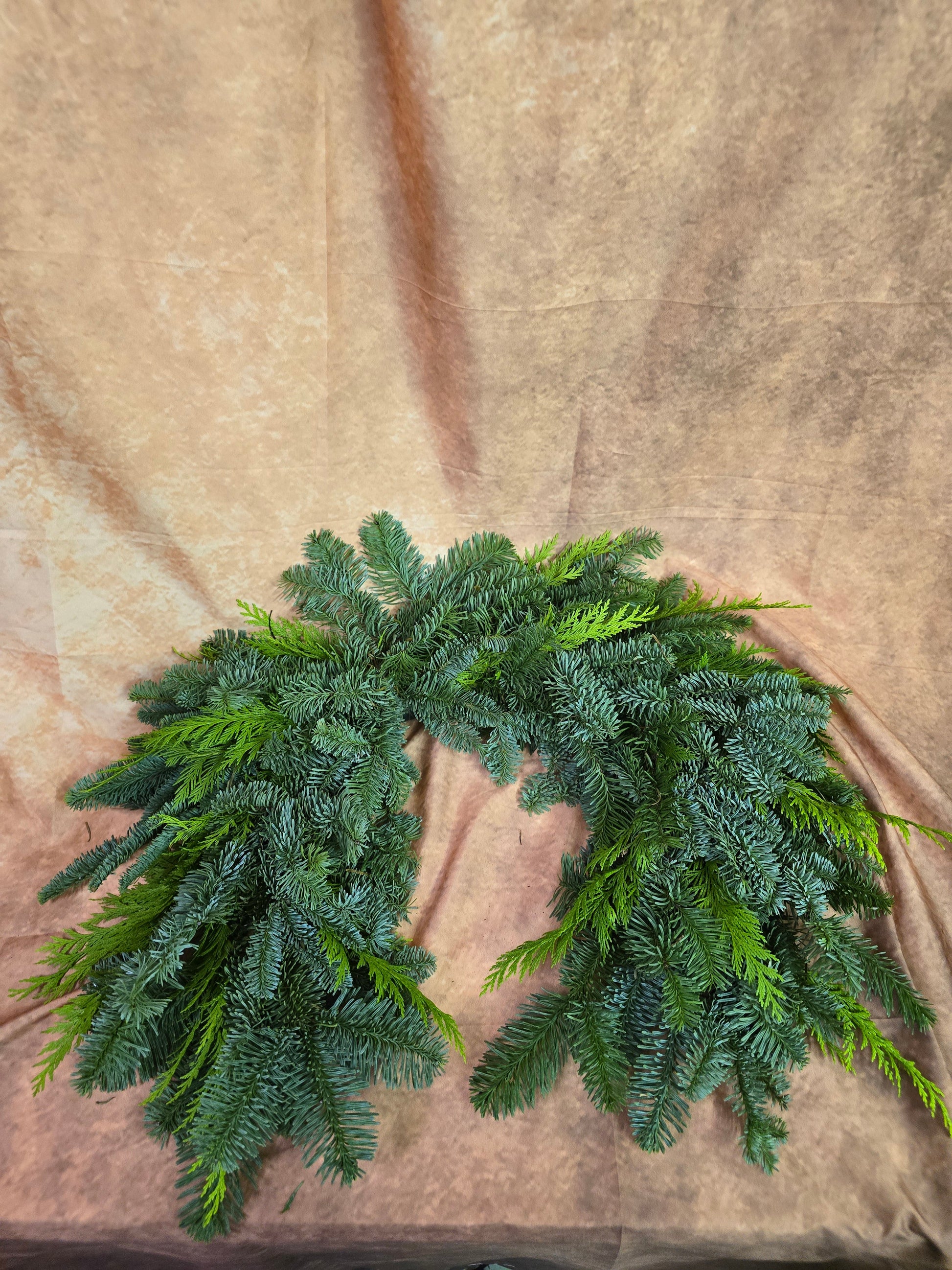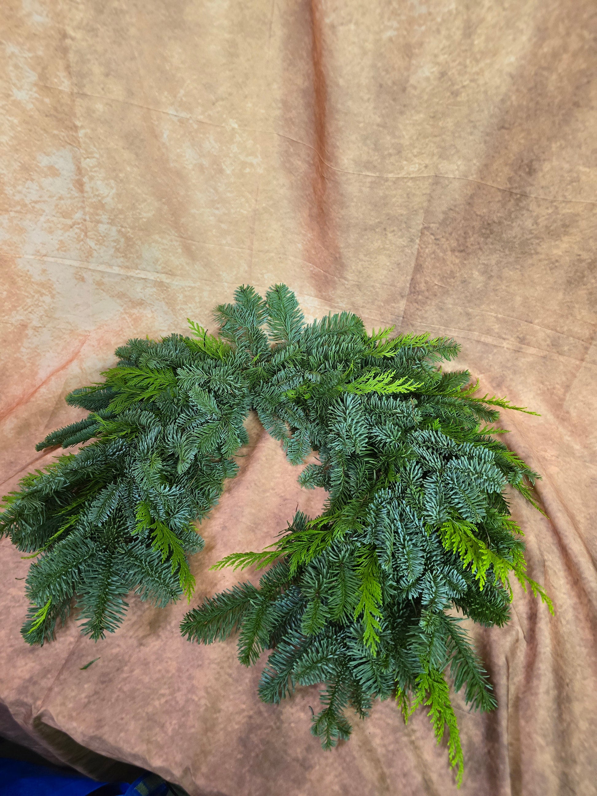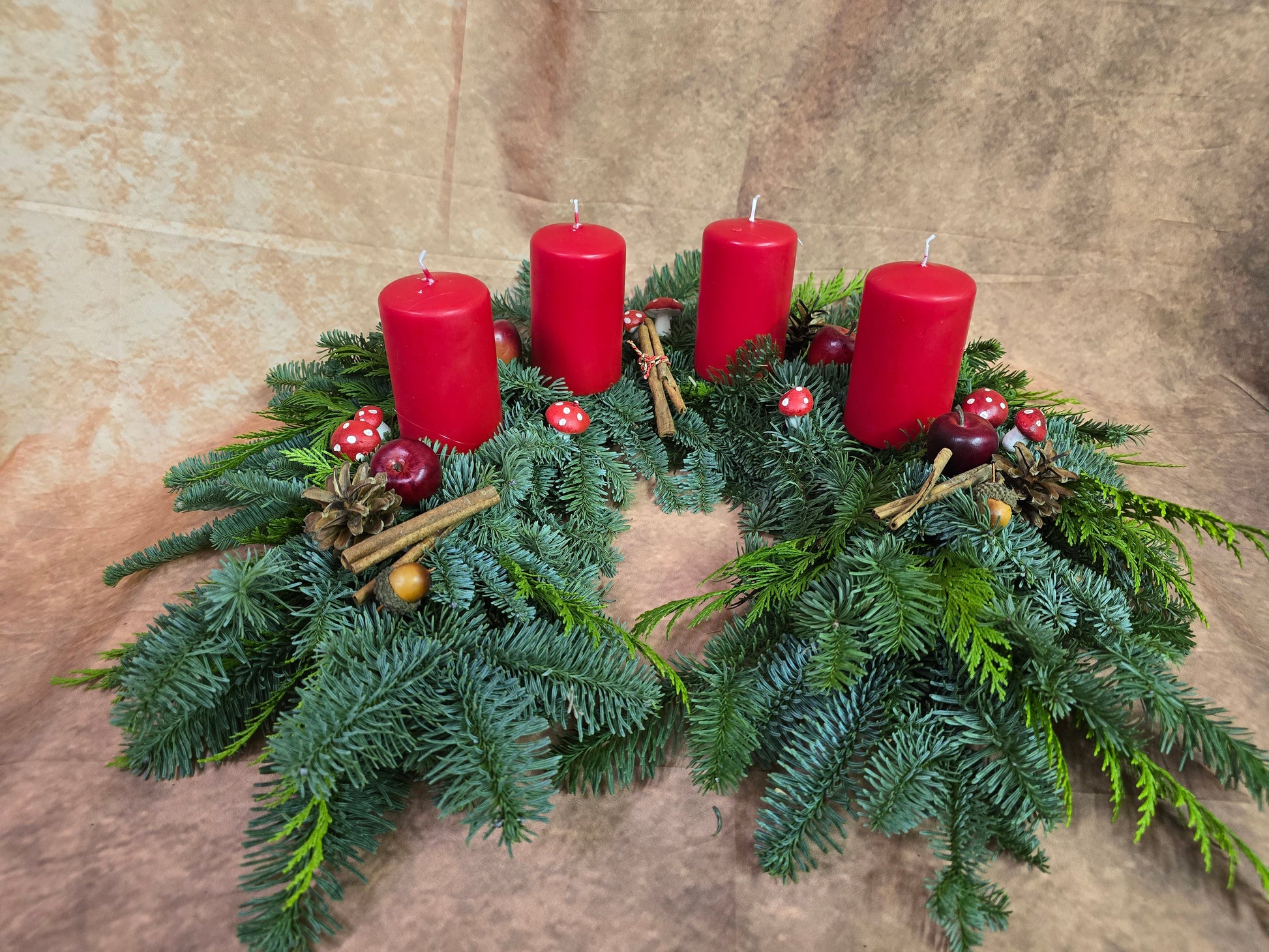 Handgewickelter Kranz für die Adventszeit mit frischer Tanne , etwas Eukalyptus , halbrund gearbeitet für ein schönes großes Gesteck