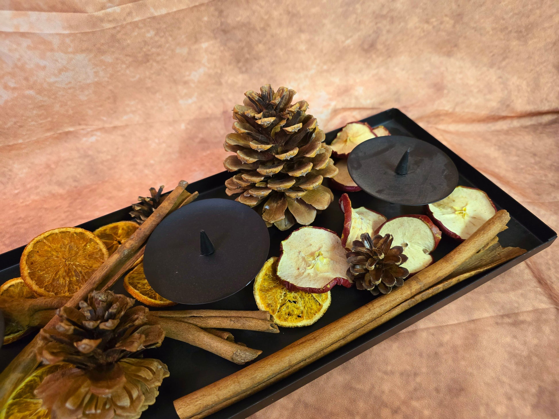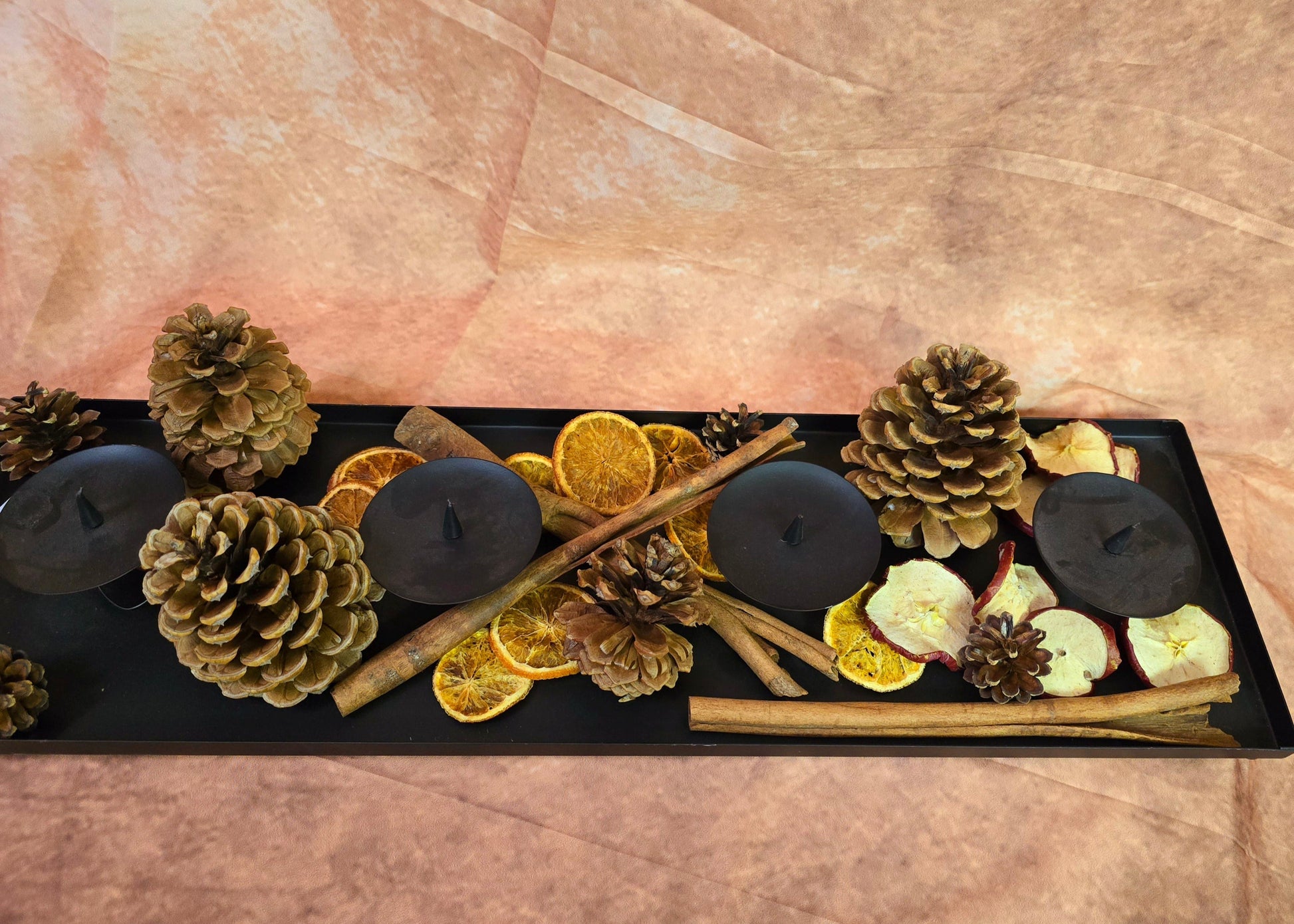 Dieser Pack besteht aus großen Zapfen, kleinen Zapfen, langem Zimt Orangen und Äpfeln.