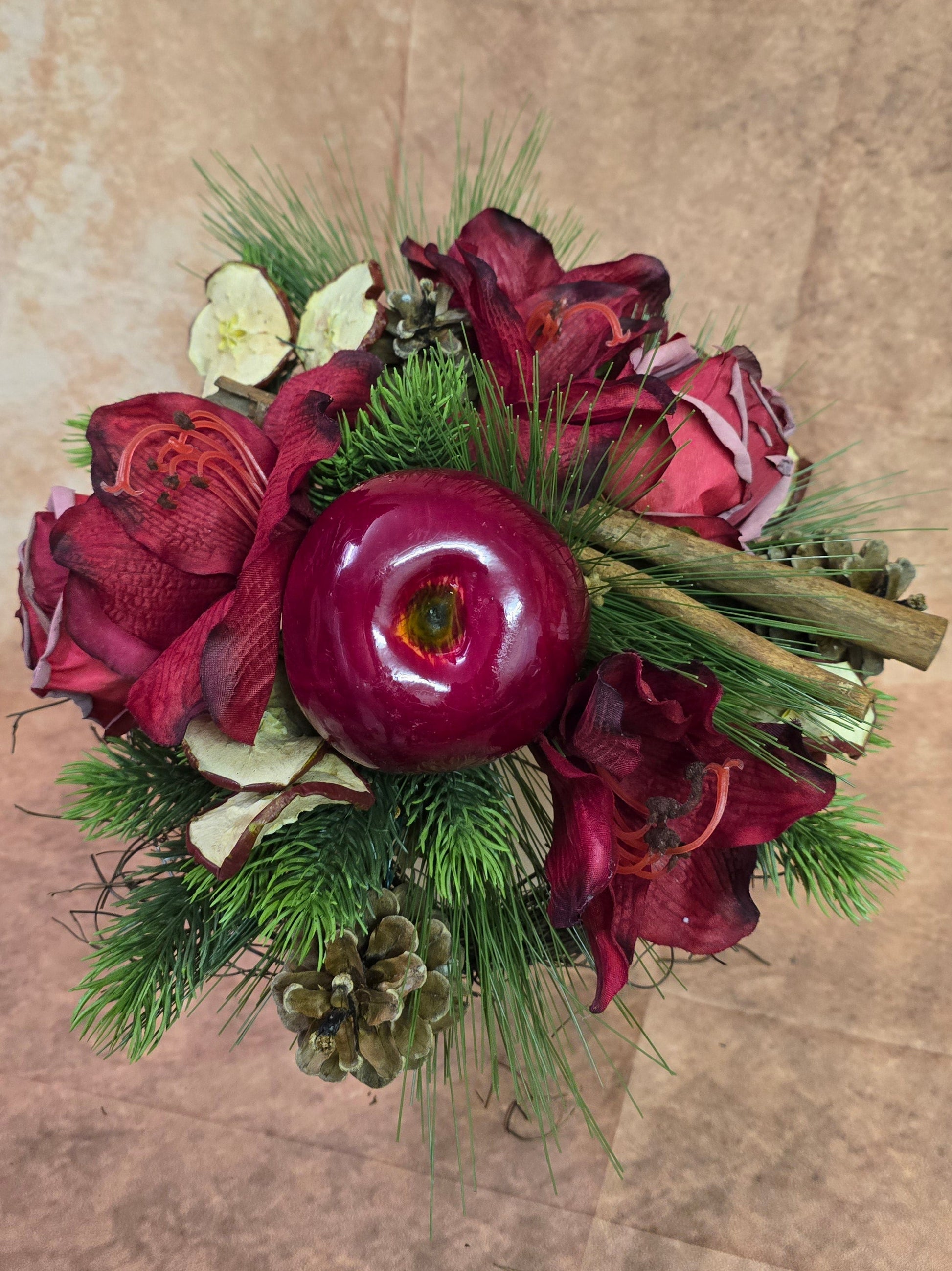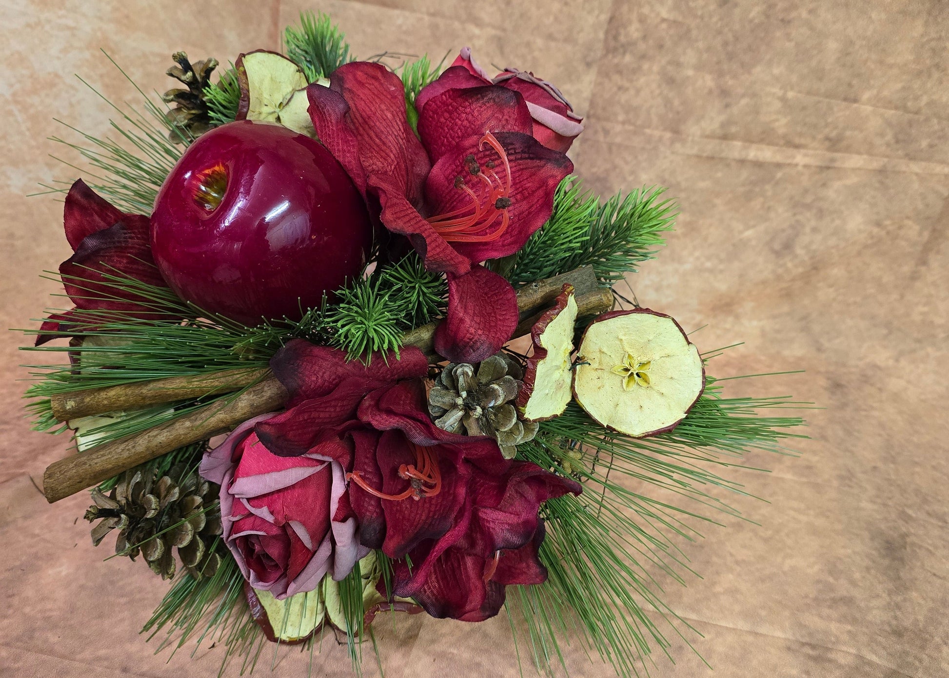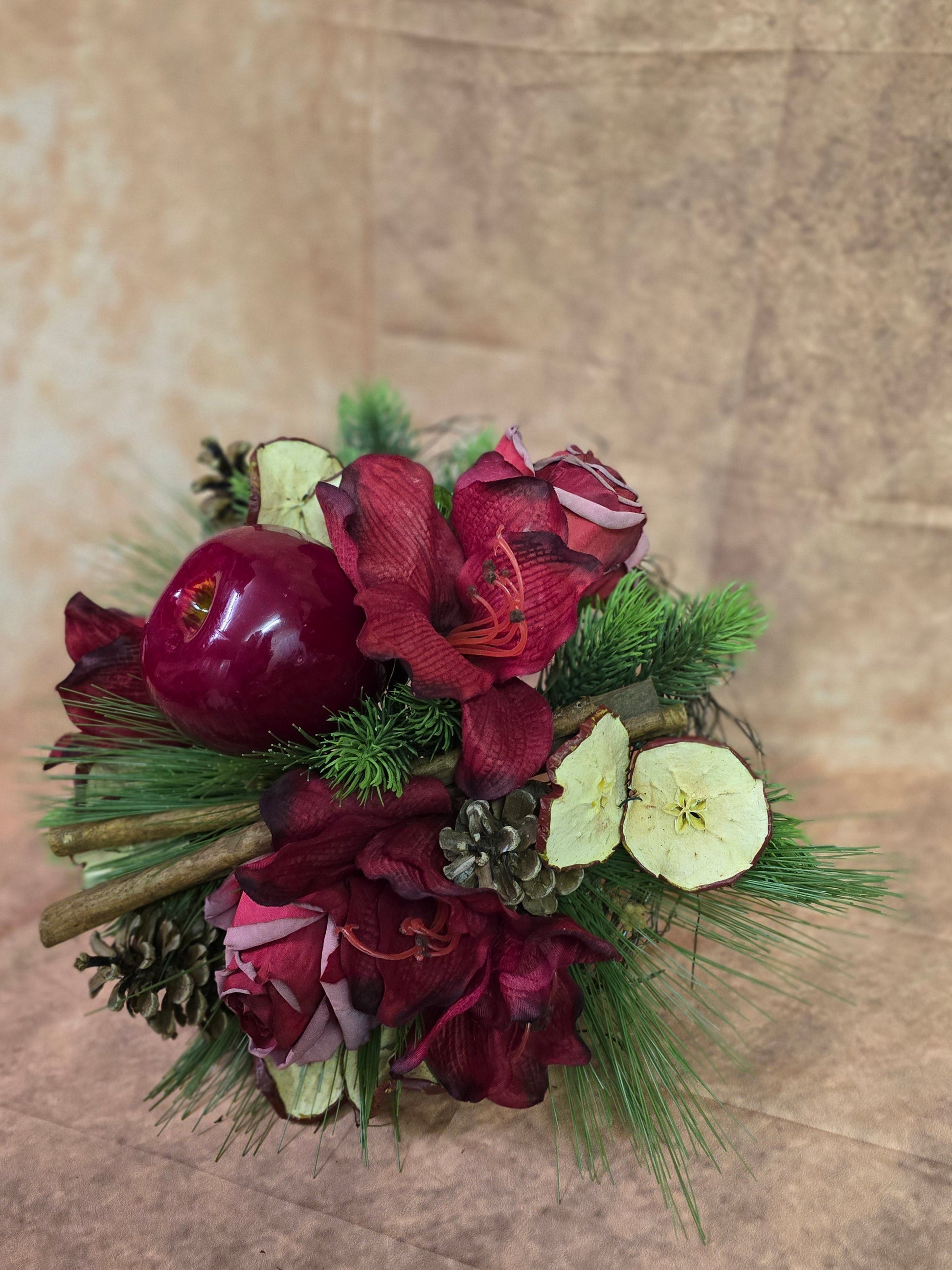 Kleiner Strauß mit Kunsttanne, Zimt, Äpfeln und Zapfen, ideal als kleines Geschenk oder für die Deko ohne Kerzen im Job.