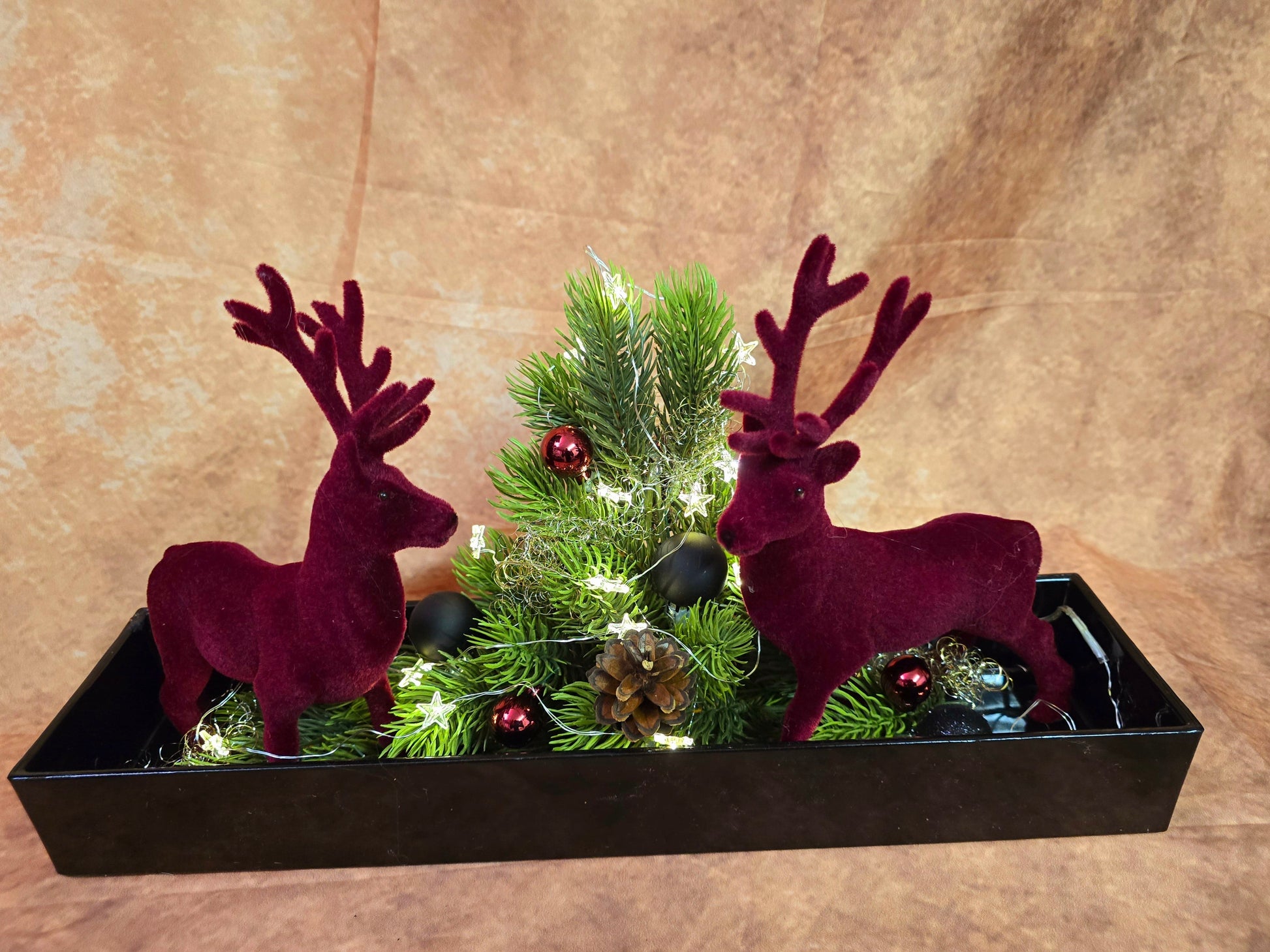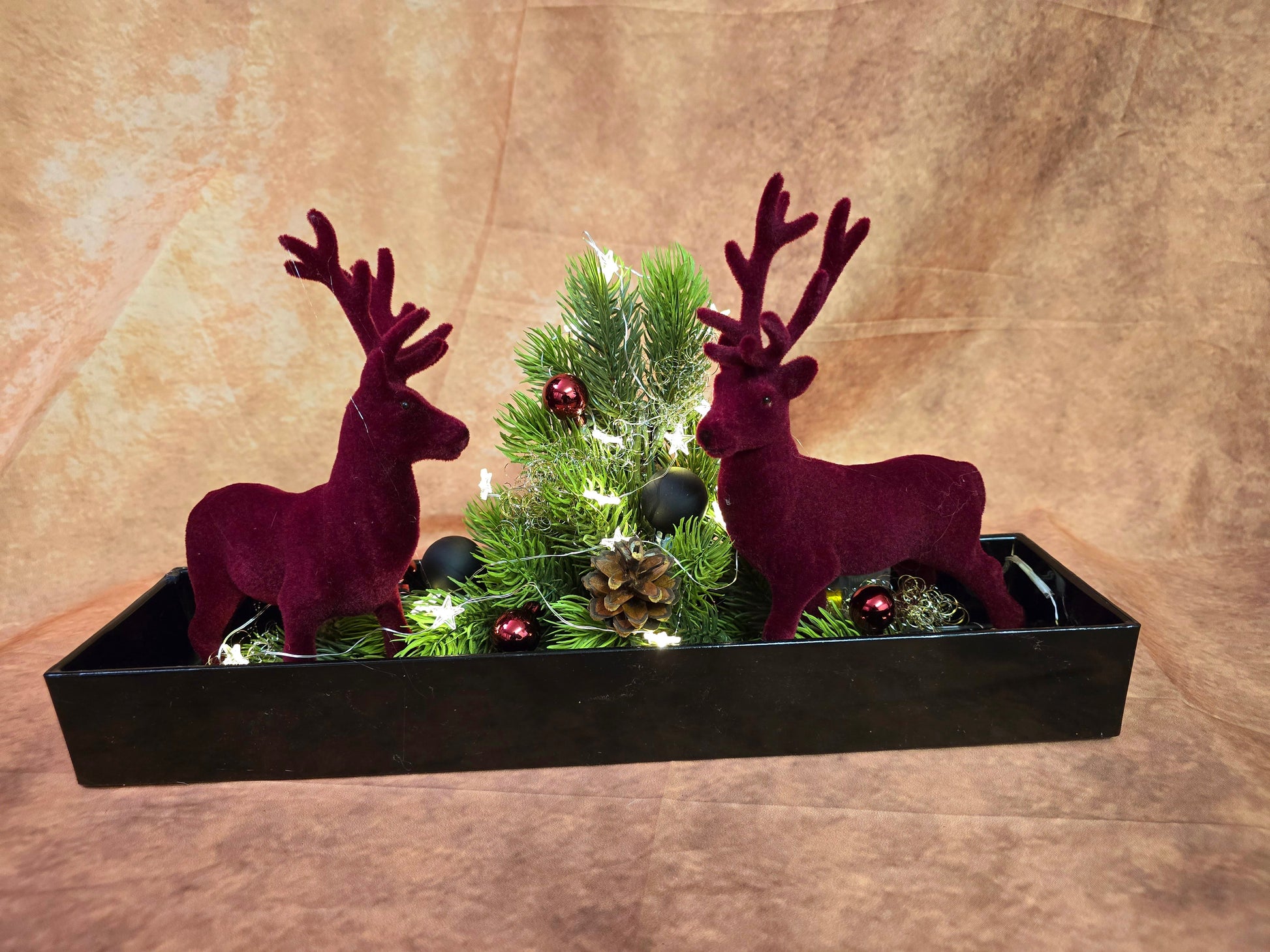 Schwarzer Teller ca 30cm mit Kunsttanne, Hirschen und Kugeln, ideal als Geschenk oder für die moderne Adventsdeko. Inclusive der Lichterkette