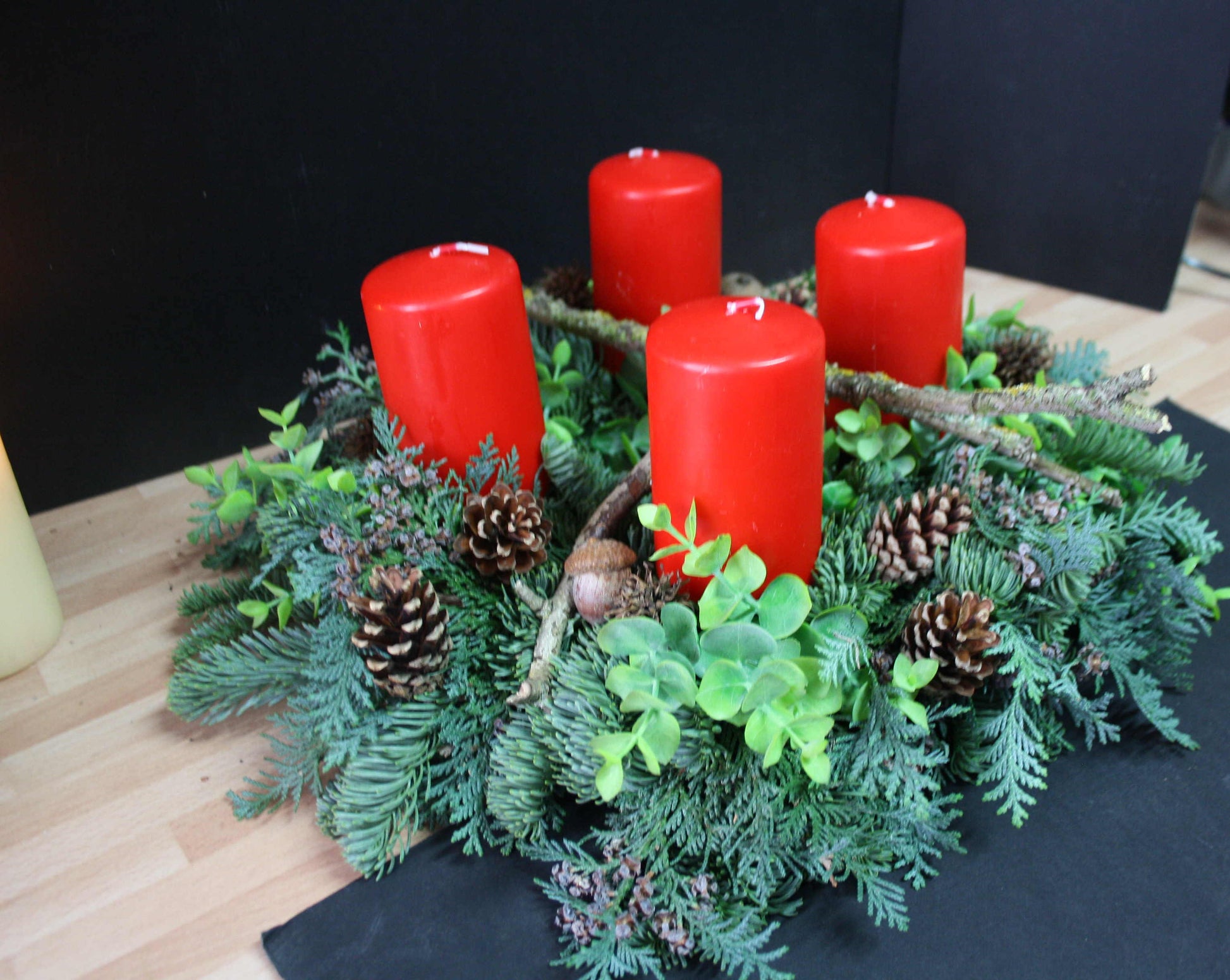Adventskranz rot mit Eukalyptus klassisch rund gesteckt