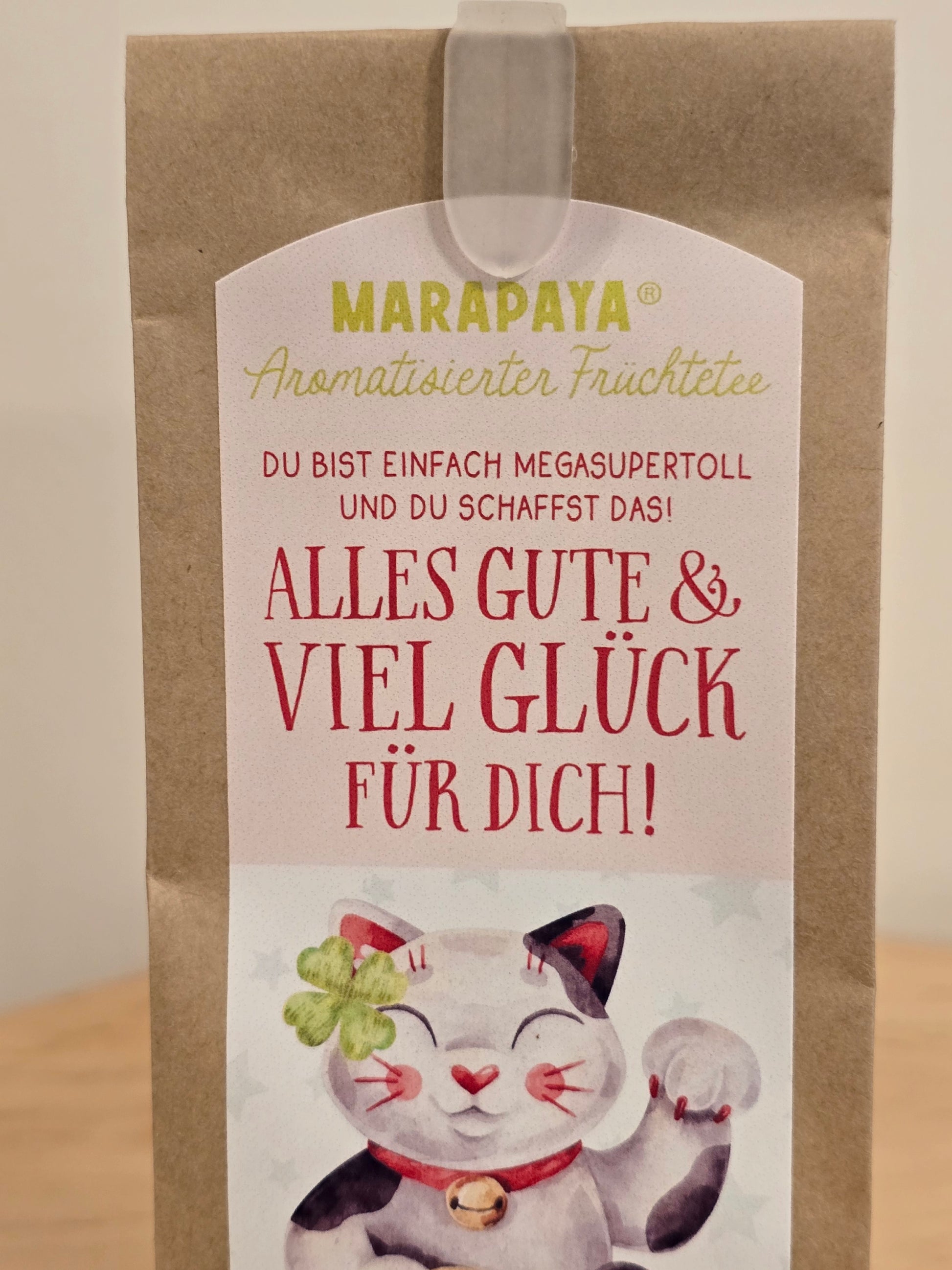 Säurearmer Früchtetee mit Roibos kombiniert und Papaya. Dies ist unser Glückstee, verschenke ihn einfach deinen Freunden vor Prüfungen , ein super Geschenk